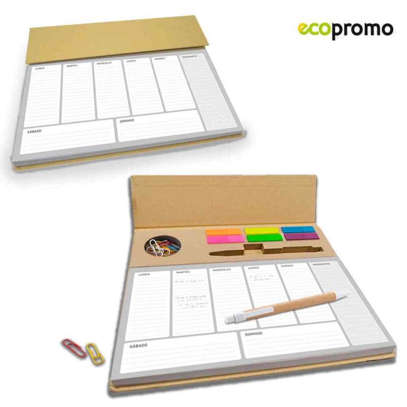 Planeador ecológico. Tapa dura con 100 hojas aprox. Incluye clips surtidos, bolígrafo y juego de 6 stickies de colores plásticos. Medidas: 24.6 cm x 19.8 cm Marca: 5