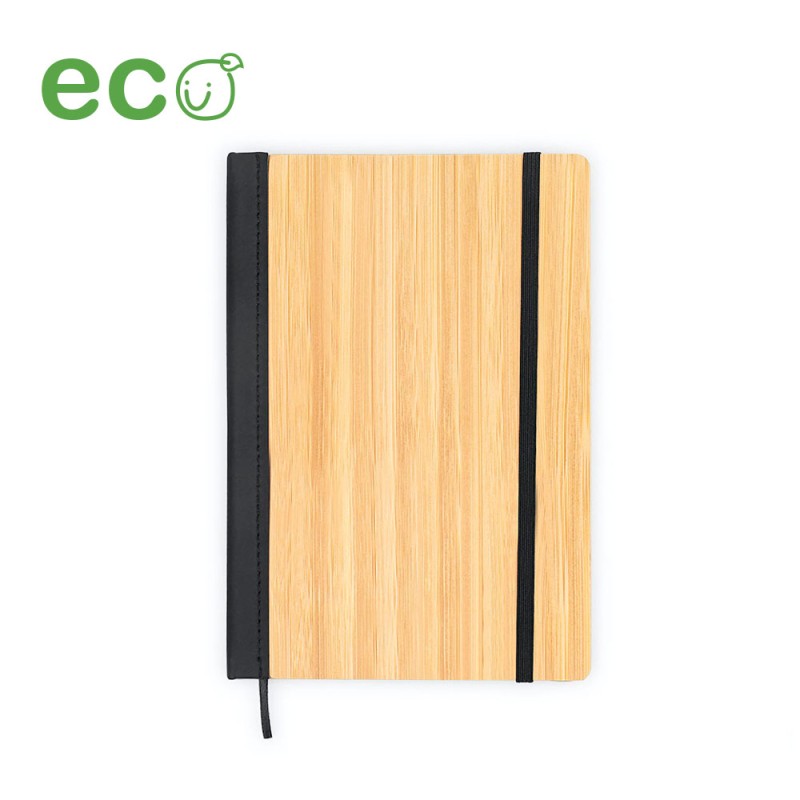 Libreta con cubierta en Bambú. Con banda elástica de cierre. Cinta marcadora. 80 hojas rayadas. Tamaño aproximado de la hoja: A5.