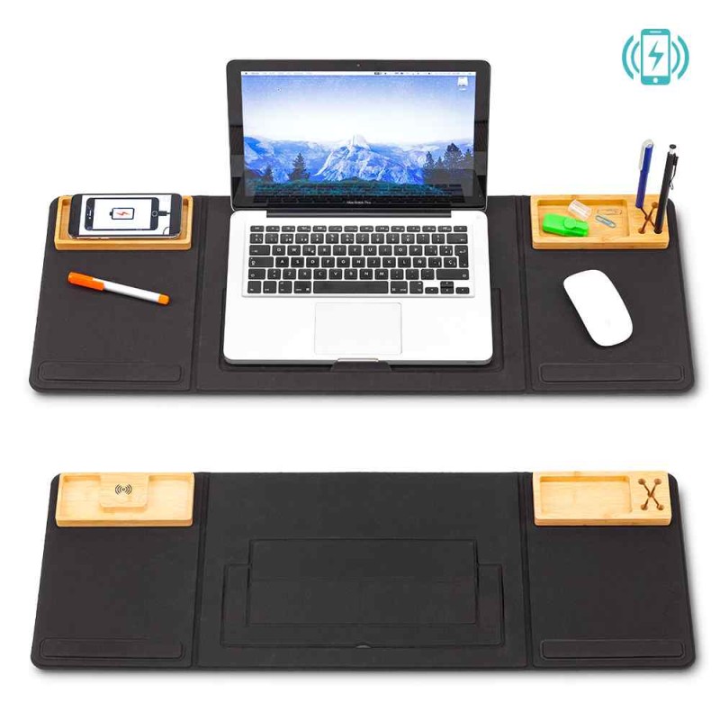Estación portátil de trabajo plegable, con soporte para laptop de hasta 14”, mouse pad, cargador inalámbrico y organizador de elementos pequeños. Medidas: