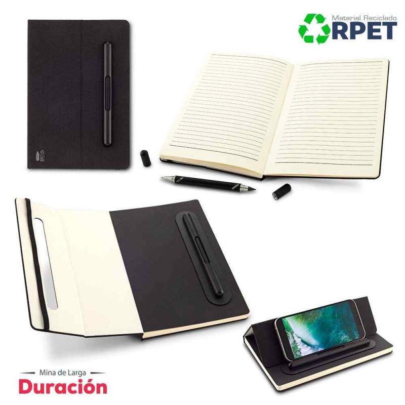 Libreta de 80 hojas, con cubiertas en poliéster reciclado RPET. Con soporte para telefono. Bolígrafo y lápiz tipo Iinfinity, con una mina que no se acaba fácilmen