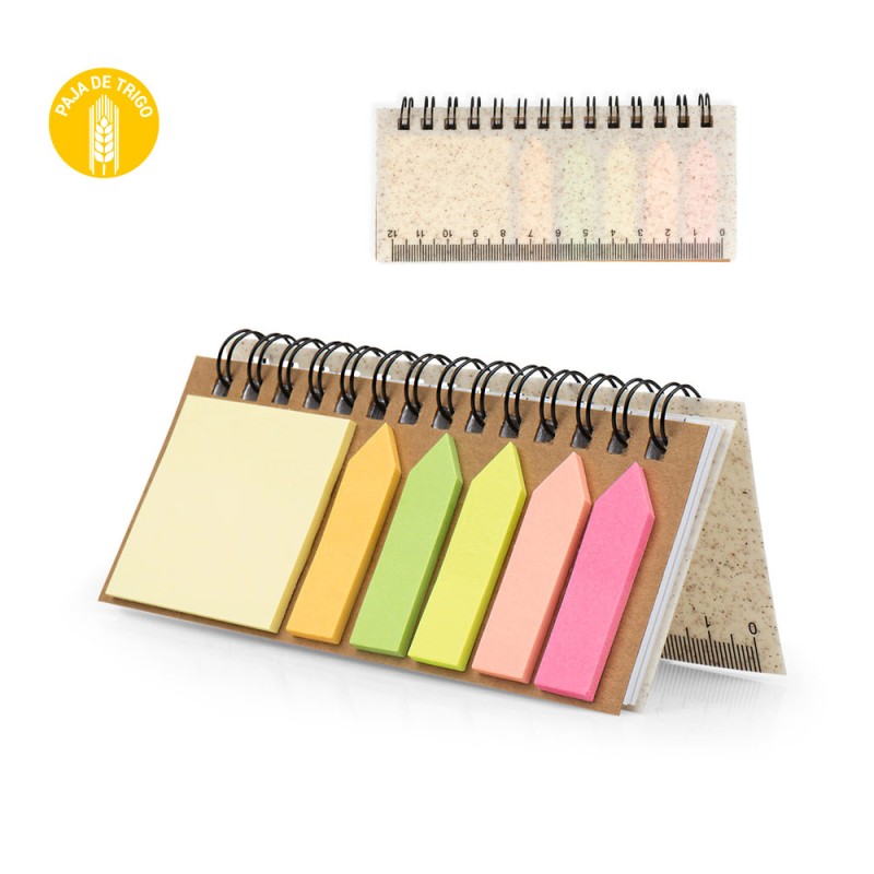 Set de memos con argollado 'doble O' y cubierta en paja de trigo. Incluye taco de 40 hojas rayadas y 5 juegos de banderas adhesivas en papel de colores de 25 hojas cada uno, además de una regla de guia de 12 centímetros en la tapa.