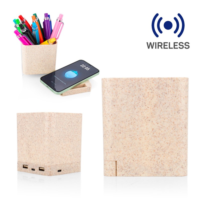 Cargador inalámbrico de 10 W con concentrador USB 2.0 y dos entradas Tipo C. Diseño multifuncional que permite almacenar artículos en su interior. El cargador inalámbrico se extrae fáci