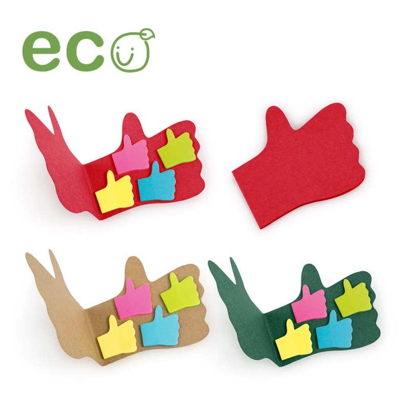 Memo con cubierta con forma de mano con pulgar arriba. 25 notas adhesivas por color (4 colores).