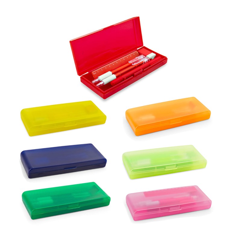Set de escritorio en estuche plástico, contiene: resaltador, bolígrafo, portaminas, regla y borrador.