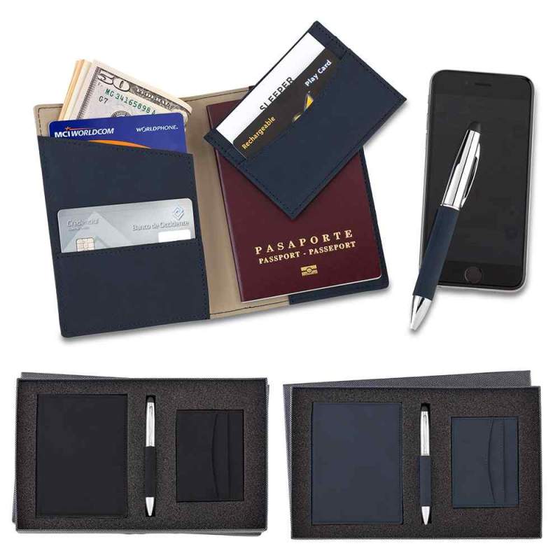 Set de bolígrafo, portatarjetas y portapasaporte en Poliuretano.  Empaque Caja Individual. Medidas Caja: 28.5 cm x 17.5 cm Marca: 6 cm / Screen Ficha Técnica