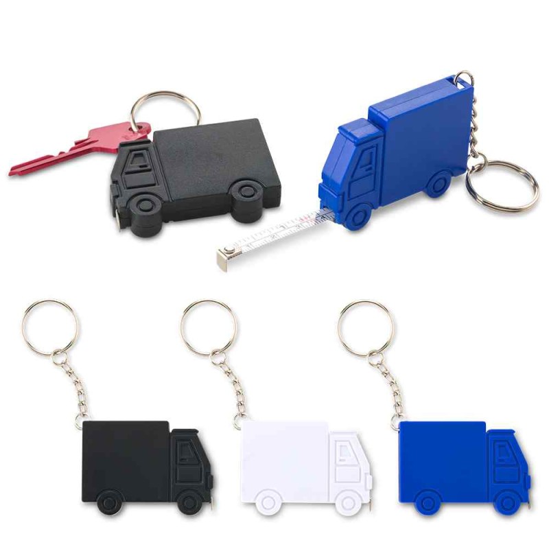 Cinta métrica de 1 m y llavero plástico en forma de camión. Medidas: 5,5 cm x 4 cm x 1 cm Marca: 2 cm / Tampografía Venta mínima y en múltiplos de caja de 50 unidades. Ficha Técnica