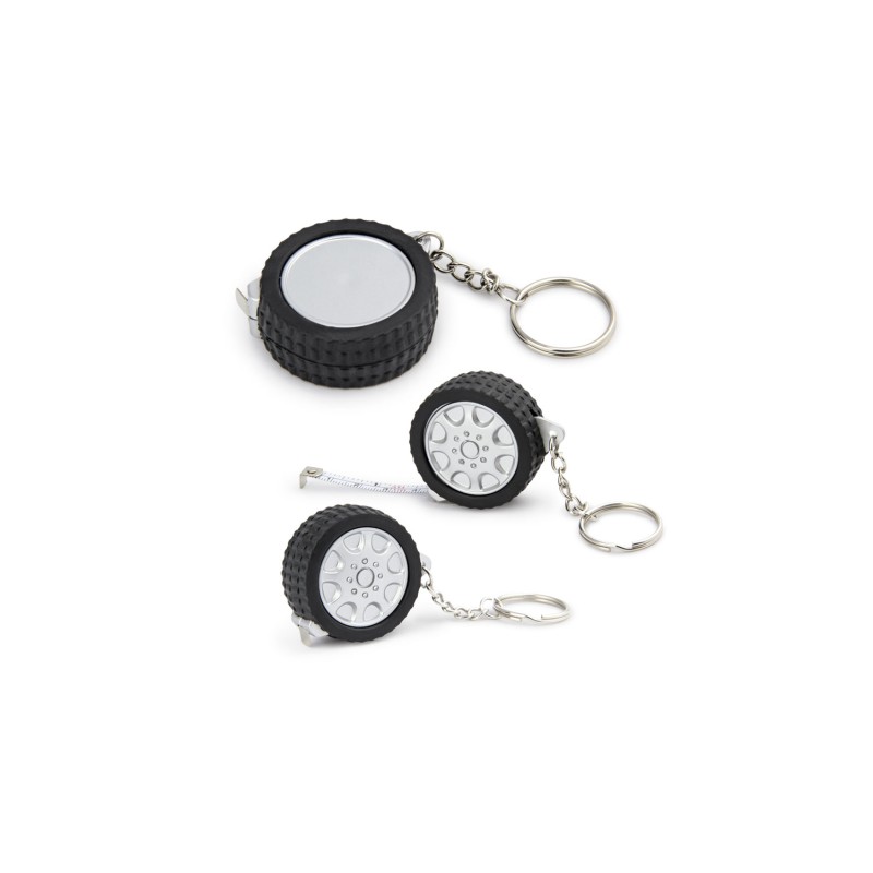 Llavero con cubierta con forma de llanta. Con cinta métrica metálica de 1m/39 pulgadas. Con argolla para llavero.