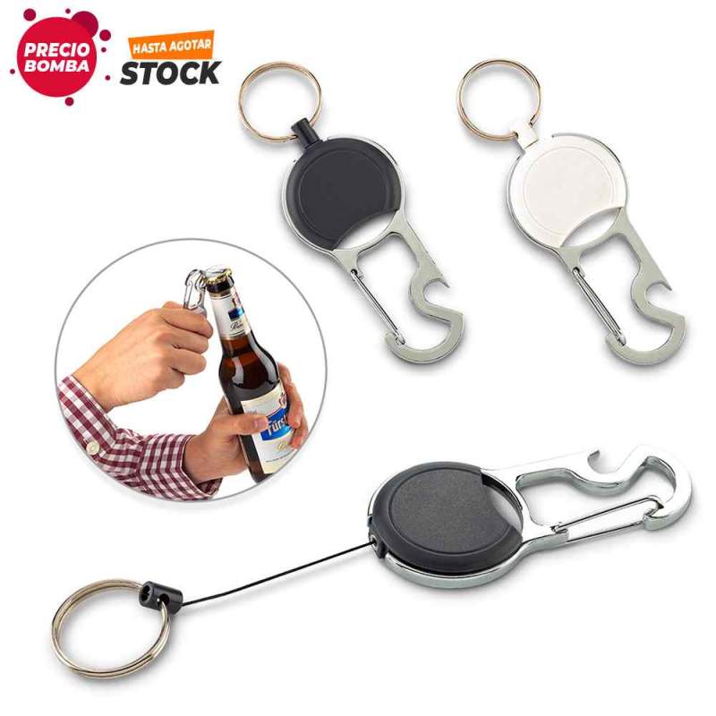 Portaidentificador con gancho carabinero en plastico y metal. Con cable retractil, destapador y argolla para llavero. Medidas: 10.2 cm x 3.6 cm Marca: 1.5 cm / Tampografía Ficha