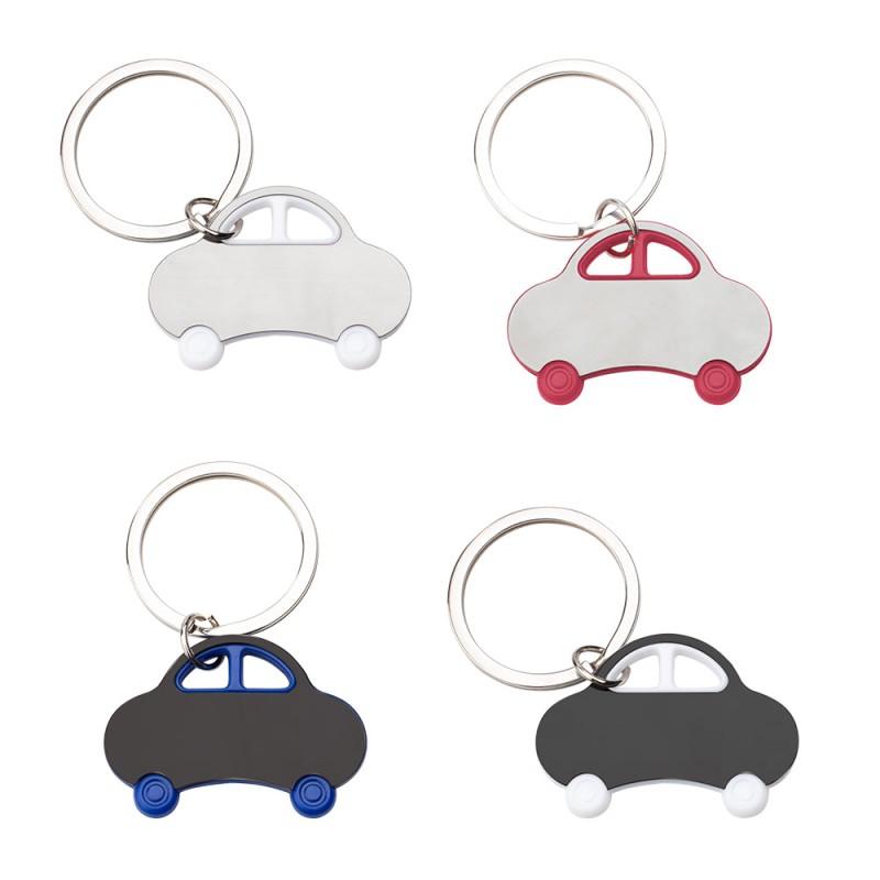 Llavero metálico con forma de automóvil. Diseño moderno en acabado bicolor con detalles plásticos en contraste. Incluye anillo metálico resistente para mayor durabilidad.