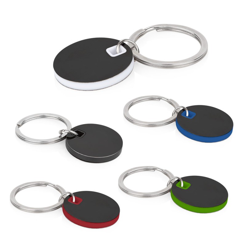 Llavero metálico con forma redonda. Diseño elegante de acabado bicolor, con detalles en plástico de alto contraste. Incluye anillo metálico resistente.
