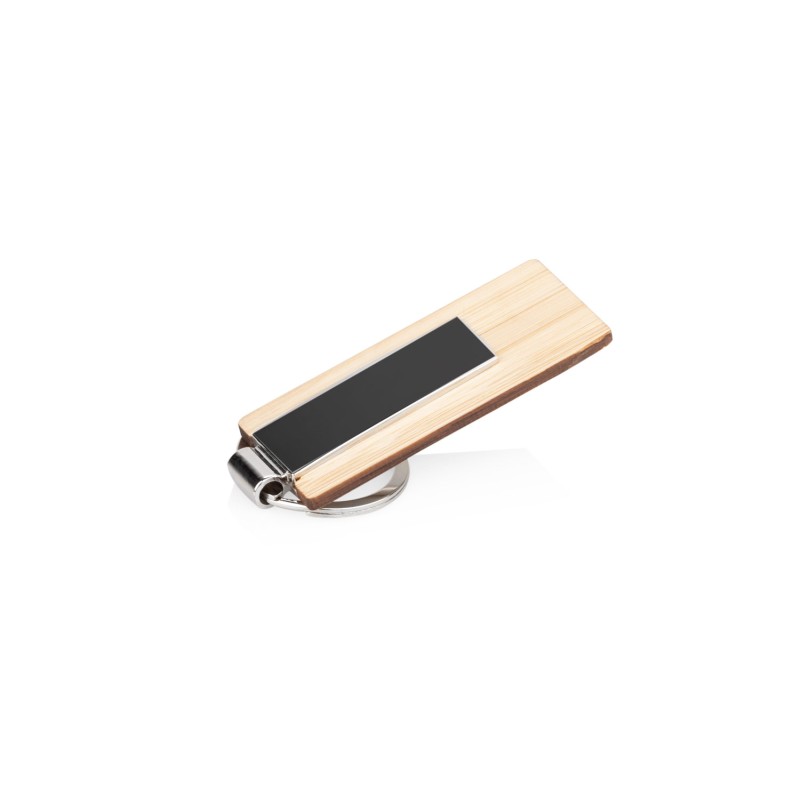 Llavero rectangular de bambú, con metal para marcar. Diseño moderno que combina materiales naturales y metálicos. Acabado liso y elegante, con anillo metálico resistente.
