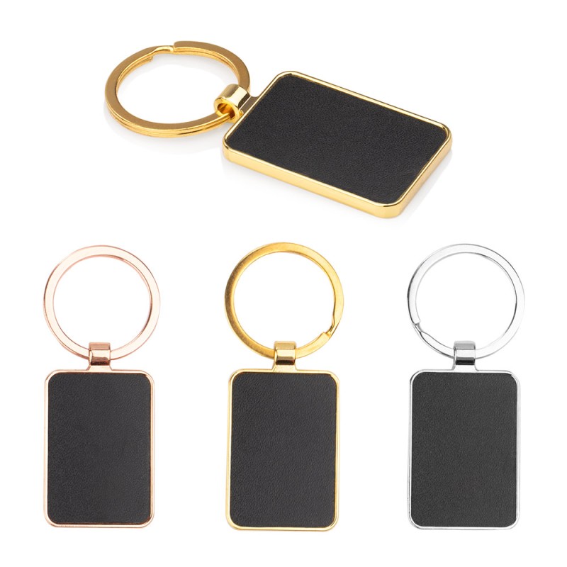 Llavero metálico con forma rectangular. Superficie oscura para marcación.