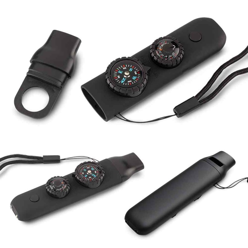 Pito plástico 5 en 1. Con brújula, termómetro, lupa y linterna con 2 leds (Funciona con 3 pilas de reloj AG13 (incluye pilas). Empaque caja individual. Medidas: 12 cm x 3 cm x 1.3 cm. Marca: 5 cm / Tampografía Tratamiento Ficha Técnica