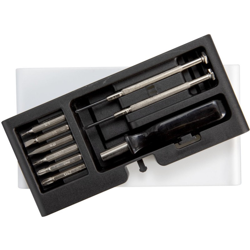 Todas las puntas en un solo estuche.Set de destornilladores. Incluye: 1 mango con punta imantada, 6 puntas diferentes (3 planas: 1,5 ; 3 y 4 mm. y 3 phillips: 0000, 0 y 1mm.) y 2 destornilladores de precisión (1 plano y 1 phillips). Base imantada que permite mantener ordenadas las diferentes puntas. Apertura push. Medidas: 7,3 x 13,7 x 2,1 cm.    Materiales: ABS, polipropileno y acero. Presentación: en caja de regalo kraft
