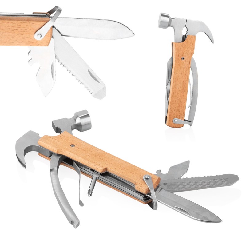 Esta herramienta multifunción cuenta con un diseño compacto y mango de madera, e integra funciones esenciales como martillo, apilador, extractor de clavos (7,2 X 13,8), dos destornilladores (pala y estrella), cuchillo (1,7 X 18,1), abrebotellas (2 X 16,2) y una lima de uñas con cuchillo de sierra (1,7 X 18,7). Su formato plegable permite un fácil almacenamiento y transporte, ideal para tareas básicas en distintos entornos.