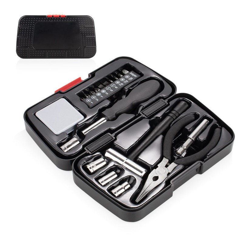 Set de herramientas que incluye: destornillador con 4 puntas tipo phillips, 2 tipo pala, 3 de precisión y 1 adaptador de copa. 1 extensor, 4 copas de 10, 9, 8 y 7 mm, pinza con cortafríos,