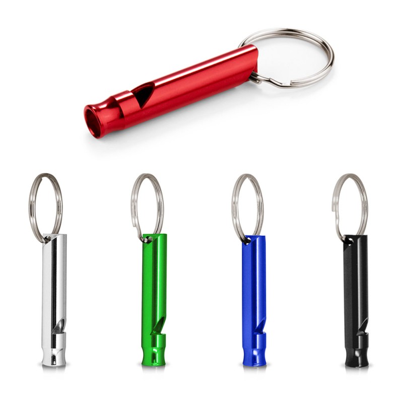 Silbato tubular metálico con argolla para llavero.