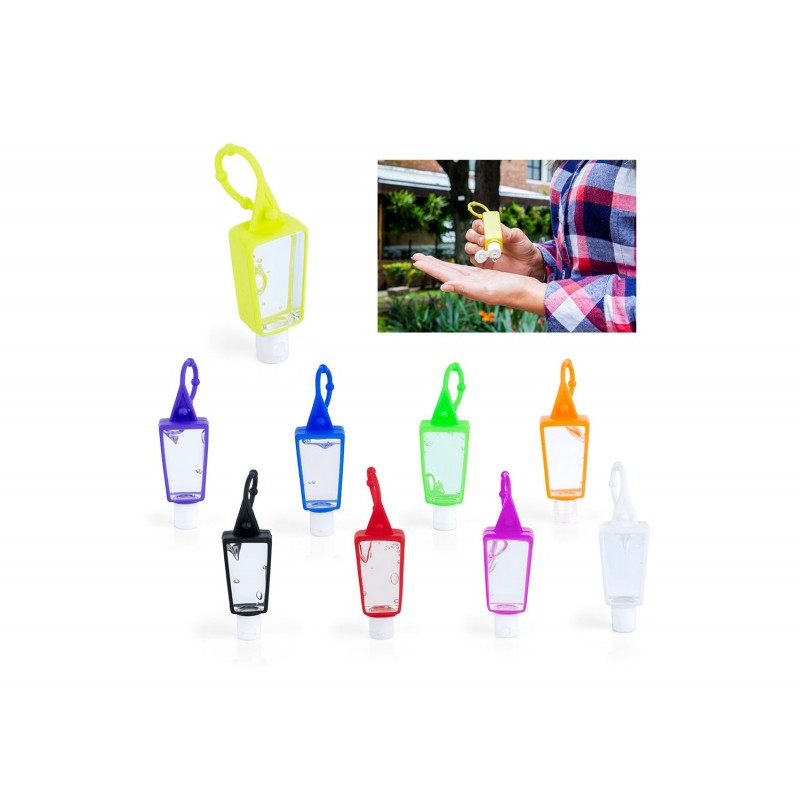Gel antibacterial en frasco flexible con tapa click redonda, aroma cítrico x 30ml con soporte tipo funda en silicona. Con registro Invima. Producto de uso personal, no se aceptan devolucion