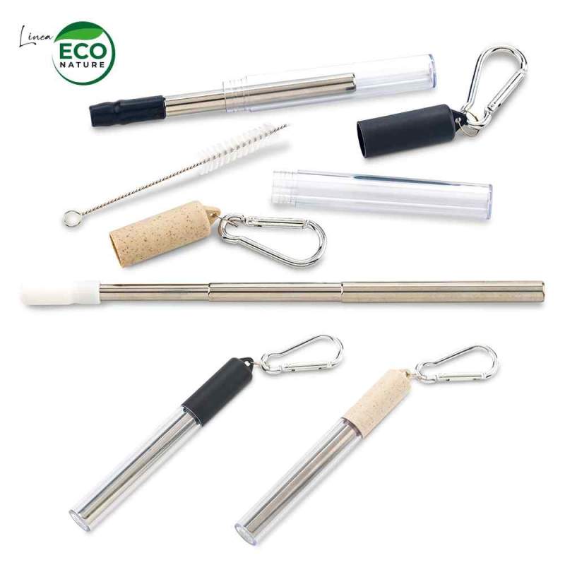 Pitillo reutilizable y extensible en acero inoxidable con boquilla de silicona. Accesorio limpiador incluido, estuche transparente con gancho para colgar y cargar elaborado con material ec