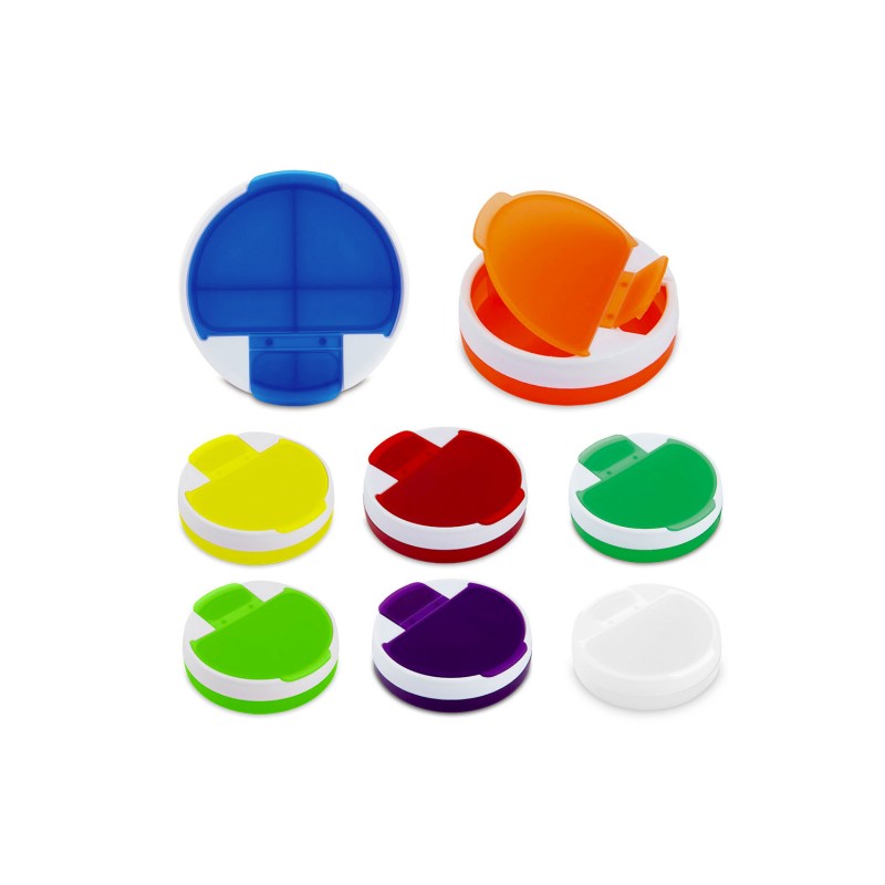 Pastillero plástico redondo de 4 compartimentos. Parte superior giratoria.