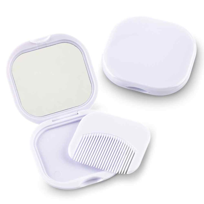 Espejo plástico con peinilla. Artículo para uso personal, no se admiten cambios/devoluciones. Medidas: 7 cm x 7 cm Marca: 3.5 cm / Tampografía Ficha Técnica