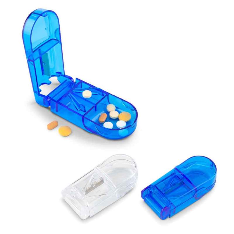 Pastillero plástico con cortador y un compartimiento. Medidas: 8.5 cm x 3.8 cm x 2.5 cm. Marca: 1.5 cm / Tampografía. Ficha Técnica