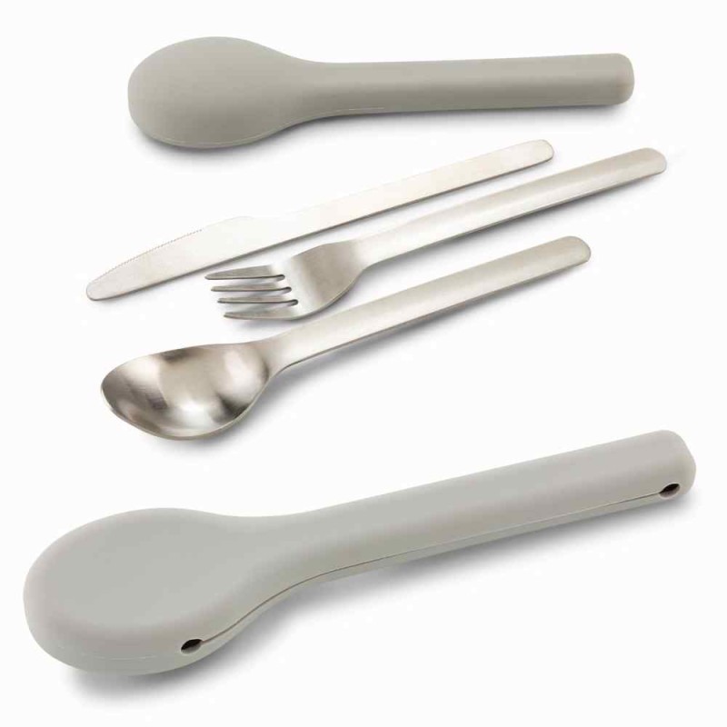 Juego de cubiertos en acero inoxidable (Cuchara, Cuchillo, Tenedor). Estuche en silicona. Medidas: 18.5 cm x 4.5 cm. Marca: 4 cm / Tampografía en silicona. Ficha Técnica
