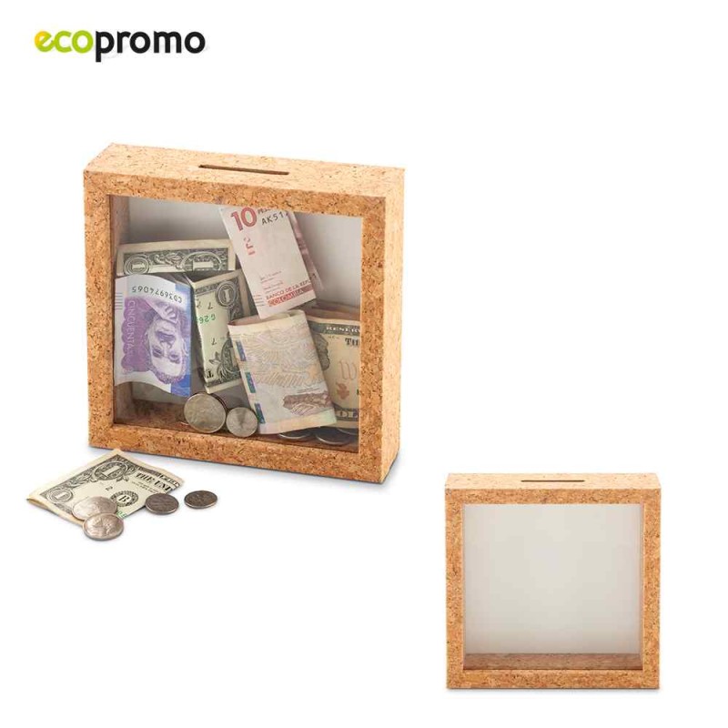 Alcancía de corcho, visor en vidrio. Empaque caja individual. Medidas: 16. 6 cm x 16.6 cm x 4.5 cm. Marca: 6 cm / Tampografía.