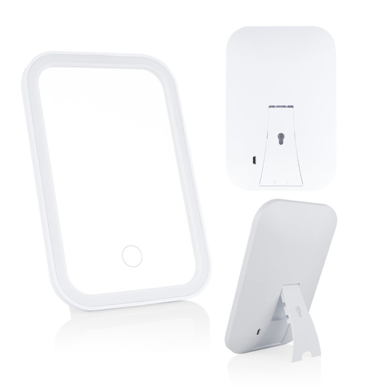 Espejo para tocador o para viaje con luz led incluida. Soporte para mesa y orificio que permite colgarlo. Permite ajustar el brillo según la necesidad.