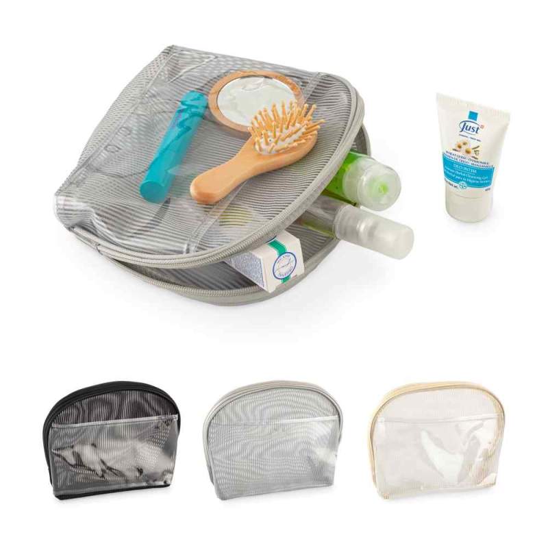 Cosmetiquera en poliéster con un bolsillo externo en PVC. Medidas: 19 cm x 17 cm x 9 cm. Marca: 8 cm / Screen / Tampografía. Ficha Técnica