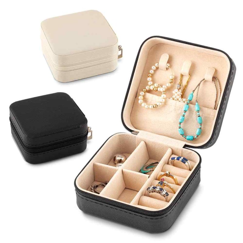 Joyero en imitación cuero con cremallera. La parte superior interna tiene 3 ganchos y un bolsillo elástico. La parte inferior interna tiene 4 compartimientos y 6 espacios para anillos. Empaque caja individual. Medidas: 9.5 cm x 9.5 cm x 5 cm. Marca: 4 cm / Tampografía. Ficha Técnica