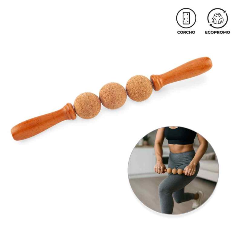 Rodillo masajeador en corcho y madera. Empaque caja individual. Medidas: 32 cm x 4 cm. Marca: 4 cm / Láser. Ficha Técnica