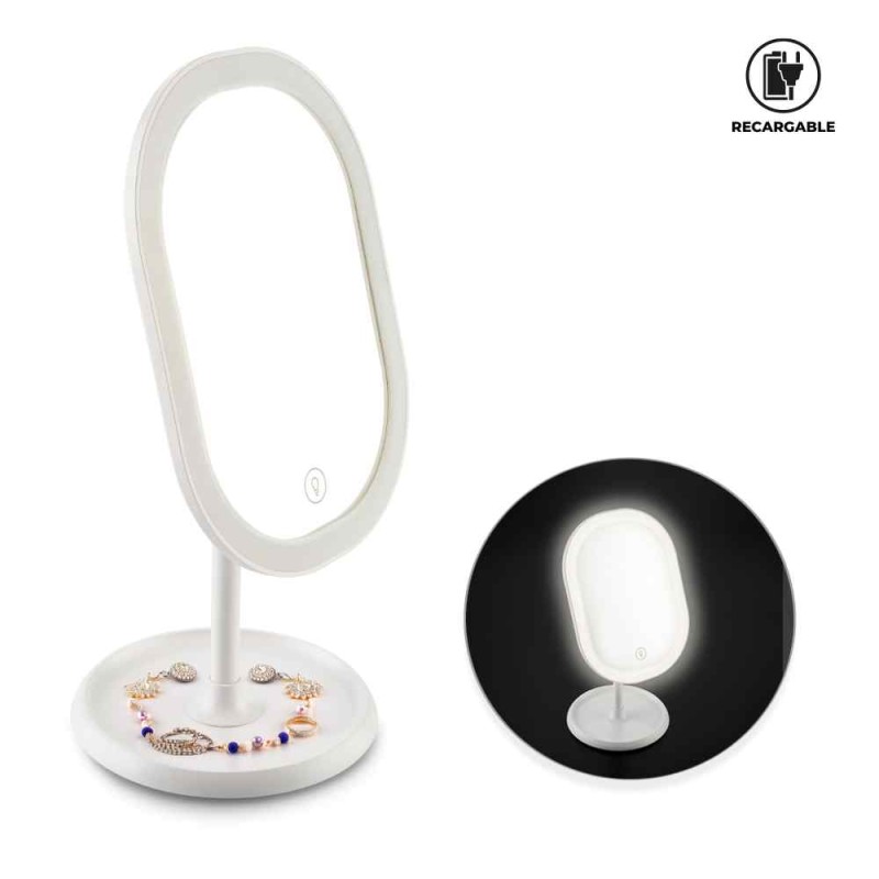 Espejo plástico con luz led y base. Con batería recargable de 1000mAh. Tres modos de luz. El espejo rota 180° hacia adelante y hacia atrás. Incluye cable Tipo C p