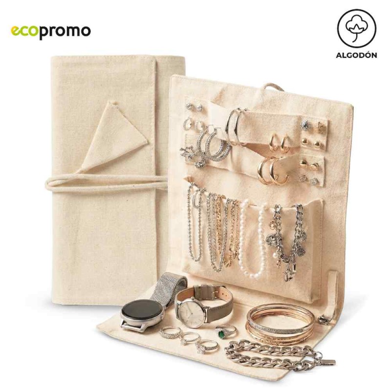 Joyero plegable en algodón. Incluye dos cintas para colgar objetos, un bolsillo sin cremallera y un bolsillo con cremallera. Incluye cordón para cerrarlo. Empaque Bolsa Individual