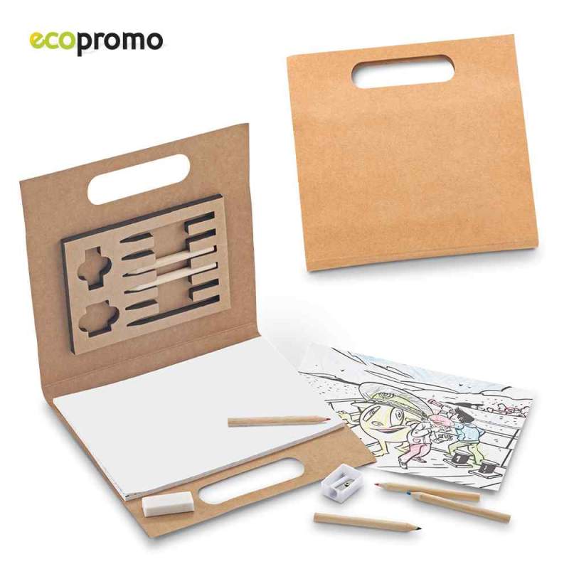 Cubierta kraft de 350 g, papel blanco de 80 g (30 páginas aprox), borrador, 6 colores, tajalápiz. Medidas: 20 cm x 21 cm x1.6 cm. Marca: 5.5 cm / Tampografía Fe de erratas: Anteriormente se publicó con bloc de papel con figuras, lo correcto es papel blanco.