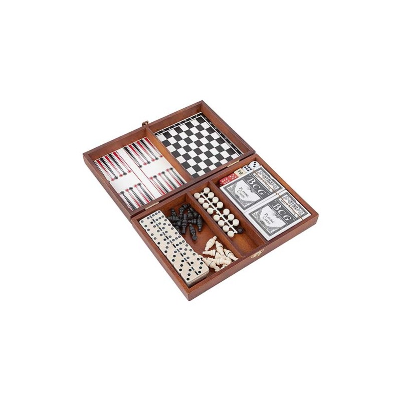 Descripción 1: SET DE JUEGO NAMIBIADescripción 2: Incluye estuche de madera con juego de ajedrez, backgammon, 2 barajas plastificadas y dominó de 28 piezas. La madera es un producto natur