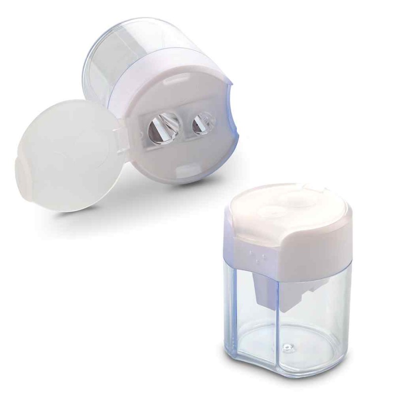 Tajalápiz plástico, con función para lápiz estándar y jumbo. Tapa plástica y depósito. Medidas: 5 cm x 3.7 cm. Marca: 2 cm / Tampografía.