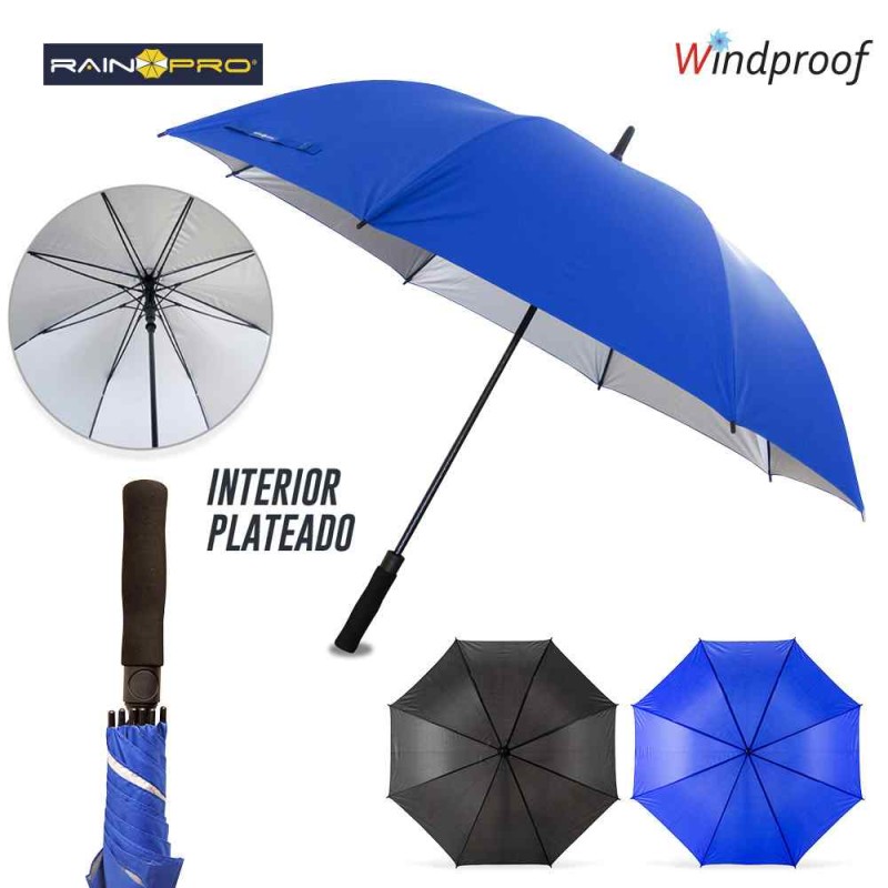 Poliéster pongee 190T. Semiautomático, herraje en fibra de vidrio reforzado. 8 Cascos y sistema antibrisa. Interior plateado. Mango en espuma Medidas: 30” Cobertura: 128