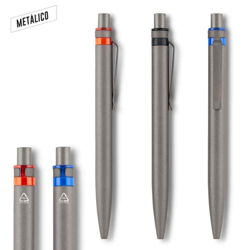 Bolígrafo elaborado en aluminio post-consumo. Clip metálico. Mecanismo push. Medidas: 14 cm . Marca: 3.5 cm / Láser Venta mínima y en múltiplos de c