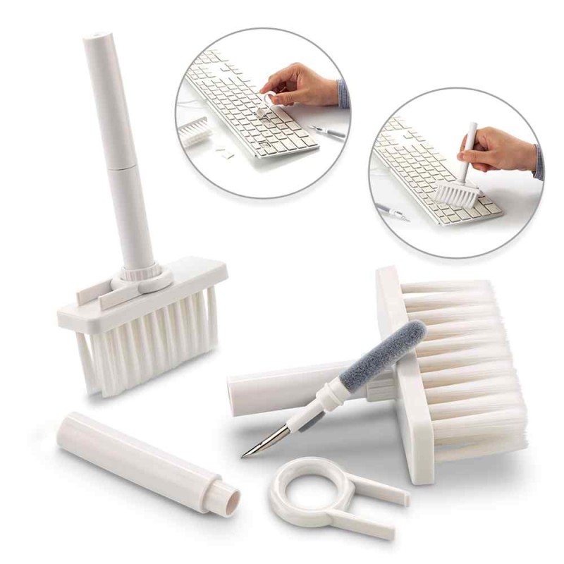 Set de limpieza multiusos que contiene un cepillo externo de cerdas suaves, un mini cepillo fino y suave, que limpia el compartimento de carga de la funda de auriculares, un cabezal de cerdas densas para una fácil limpieza del orificio de sonido de los auriculares y otras partes de los auriculares; una punta de metal para una limpieza profunda de grietas y suciedad de limpieza difícil y extractor de teclas. Se usa como multiusos y para limpieza profunda de cada esquina del teclado y auriculares. Medidas: 14.5 cm x 8 cm ancho del cepillo Marca: 3.5 cm / Tampografía