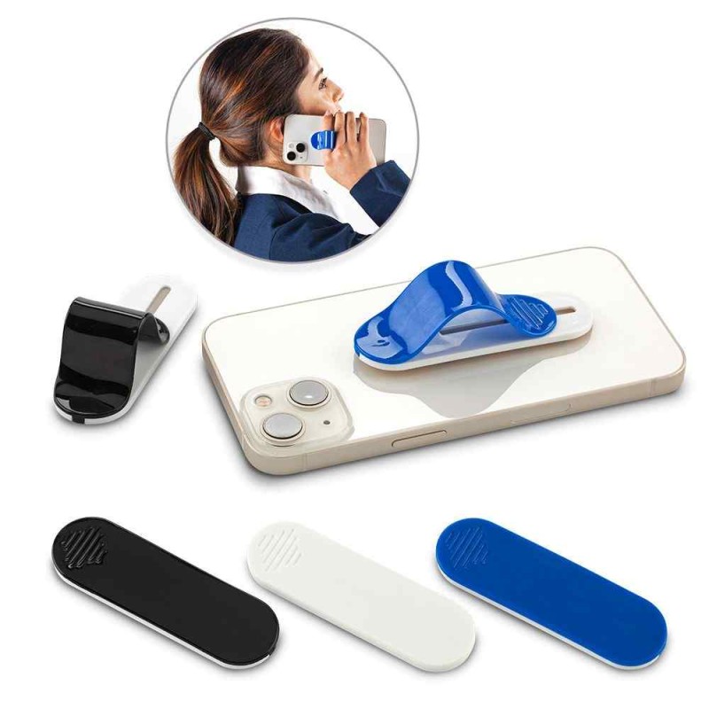 Soporte plástico flexible para móviles con adhesivo. Medidas: 8 cm x 2.5 cm Marca: 3.5 cm / Tampografía