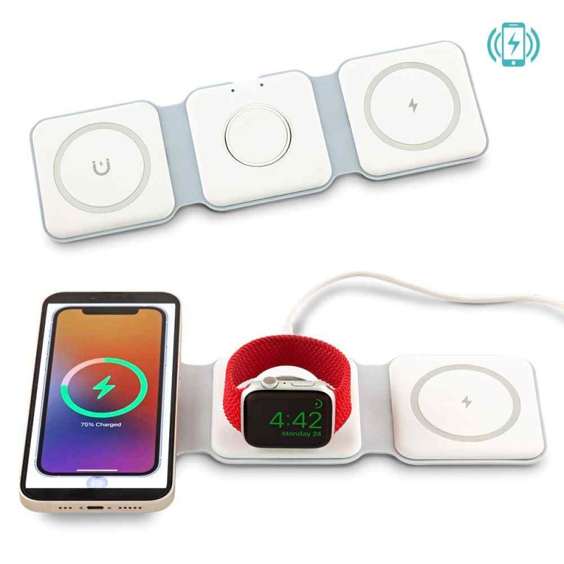Cargador inalámbrico plegable 3 en 1, en plástico y silicona. Con módulos de carga individuales para teléfono de 15W, reloj inteligente de 2W y audífonos de 5W. Compatible con dispositivos equipados con tecnología de carga inalámbrica. Empaque caja individual. Medidas Cerrado: 8 cm x 7.5 cm Marca: 4 cm / Láser (Yag)