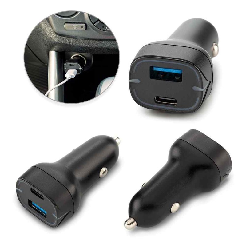 Cargador plástico dual para carro, con puertos USB y Tipo C. Empaque caja individual. Medidas: 6 cm x 3 cm x 2 cm Marca: 1.5 cm / Tampografía