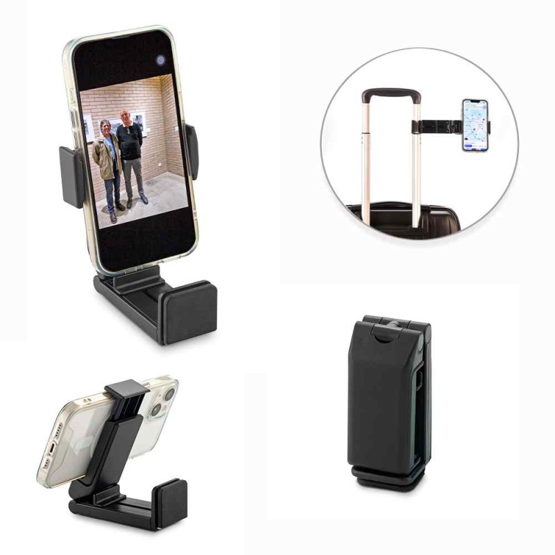 Soporte en plástico para móviles, plegable y escualizable, rotación 360°. Empaque caja individual. Medidas: 9.3 cm x 3.7 cm x 3.7 cm. Marca: 2 cm / Tampografía