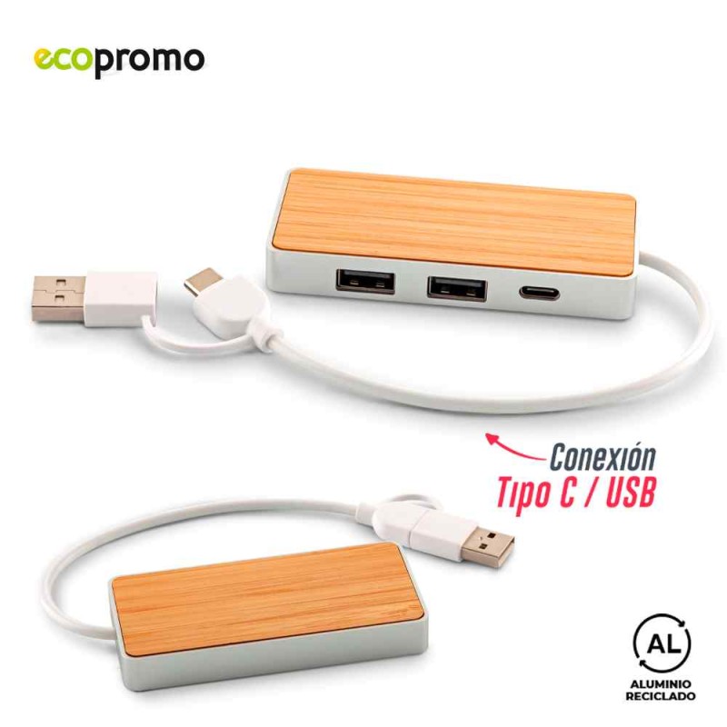 Puerto USB en bambú y acero reciclado con doble conexión Tipo C y USB. Dos puertos USB y uno Tipo C. Empaque caja individual. Medidas: 8.5 cm x 4 cm x 1 cm. Marca: 3.5 cm / Láser.