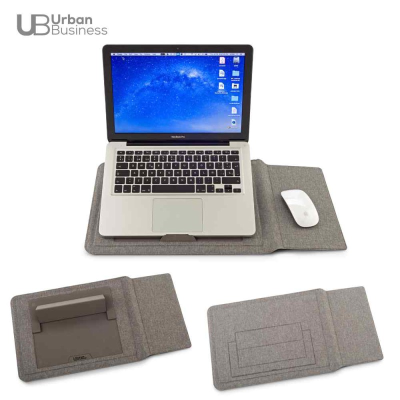 Soporte multiusos para trabajo en poliéster reciclado RPET. Tiene un soporte plegable el cuál se ajusta máximo a computadores de 16”, la solapa funciona cóm
