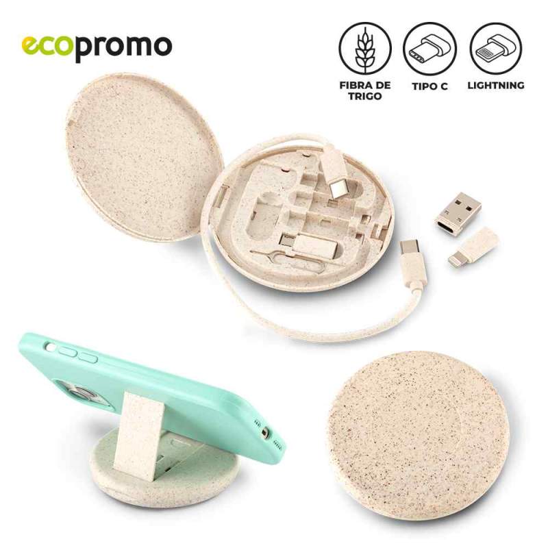 Estuche de cable de carga multifuncional elaborado en fibra de trigo. Material ecológico en fibra de trigo (50%-60%). Promedio de biodegradabilidad: 2-3 años tras su vida útil. Cable principal con extremos Tipo C. Conectores: USB, Lightning, Micro. Incluye pin de eyección de tarjeta SIM. Espacio para colocar tarjeta SIM (no incluida). Empaque caja individual. Medidas: 8 cm diámetro x 1 cm. Marca: 3 cm / Tampografía. Ficha Técnica