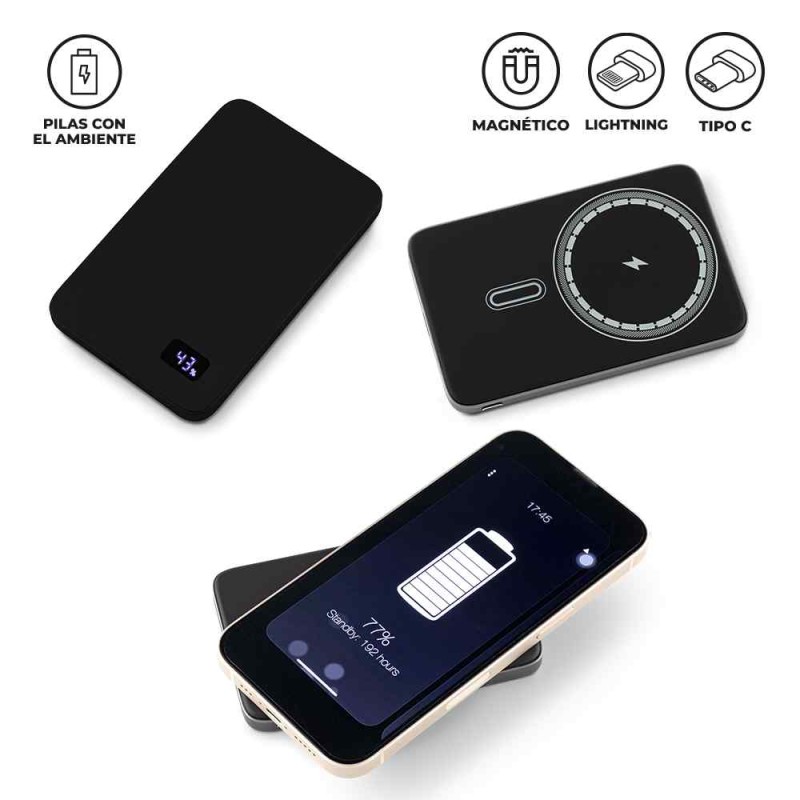 Pila recargable en aluminio de 5000 mAh. Con imán para carga inalámbrica y display de carga. Un puerto Tipo C para carga. Empaque caja individual. Medidas: 10.3 cm x 6.5 cm x 0.7 cm. Marca: 4 cm / Tampografía / Láser. Ficha Técnica