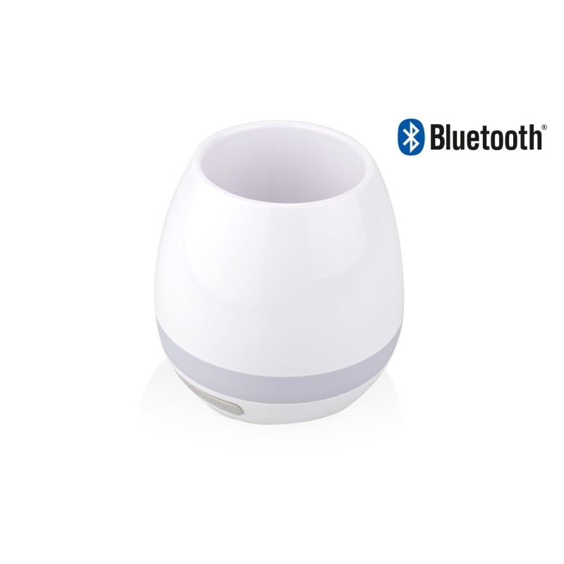 Altavoz Bluetooth con diseño multifuncional que incluye luz LED decorativa y maceta con sensores táctiles que permiten reproducir sonidos al tocar la planta; cuenta con puerto micro USB pa