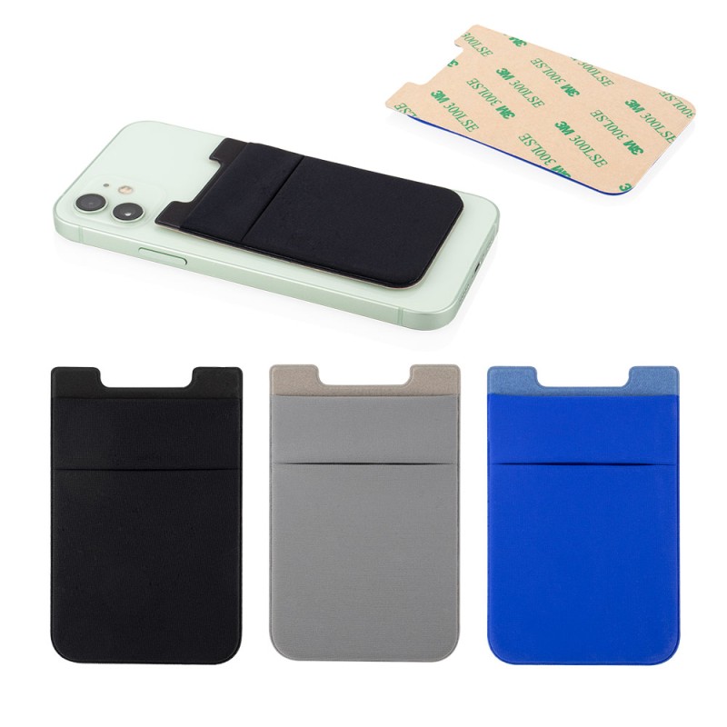 Práctico portatarjetas fabricado en lycra flexible, diseñado para adherirse a la parte trasera del teléfono móvil mediante adhesivo resistente (marca 3M). Cuenta con dos compartimientos: